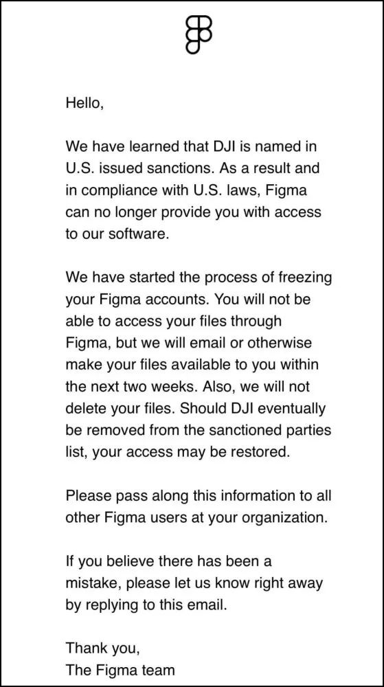 3月12日,網(wǎng)絡上傳播一則關于美國Figma制裁大疆的郵件,郵件內容如下圖: