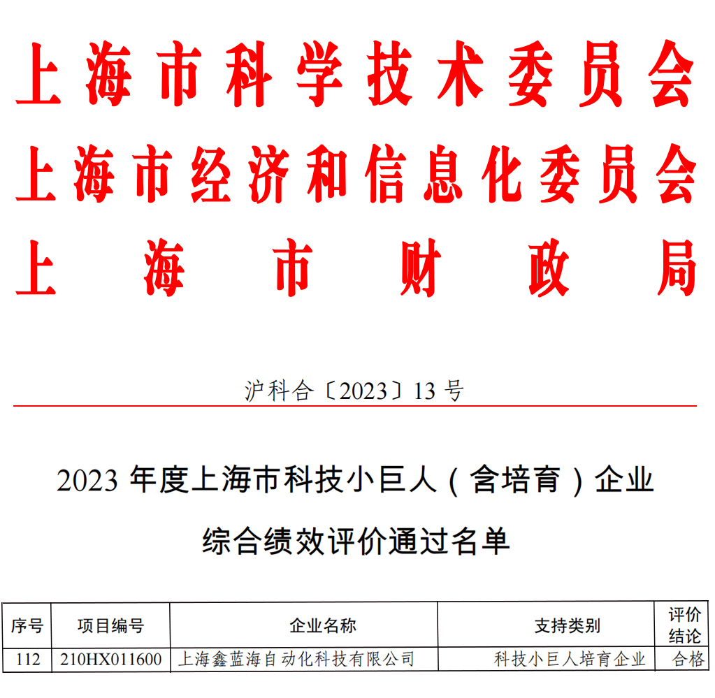 近日,上海市科學技術委員會公示了《關于公布2023年度上海市科技小巨人(含培育)企業綜合績效評價結果的通知》,經自主申報、綜合績效評價,鑫藍海順利通過本次驗收!