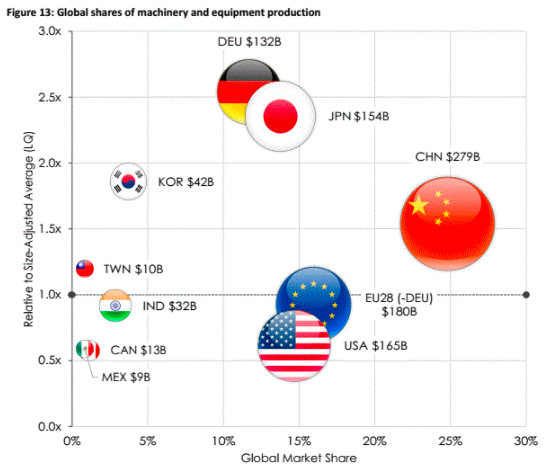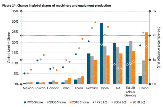 報告指出,中國機(jī)械和設(shè)備的產(chǎn)量遠(yuǎn)高于美國、日本、德國等國家,其產(chǎn)量占全球產(chǎn)量的25%,居世界首位。自1995年到2018年,在西方發(fā)達(dá)國家的全球市場份額有所縮減的情況下,中國機(jī)械和設(shè)備的全球市場份額增加了557%,形成此消彼長的局面。